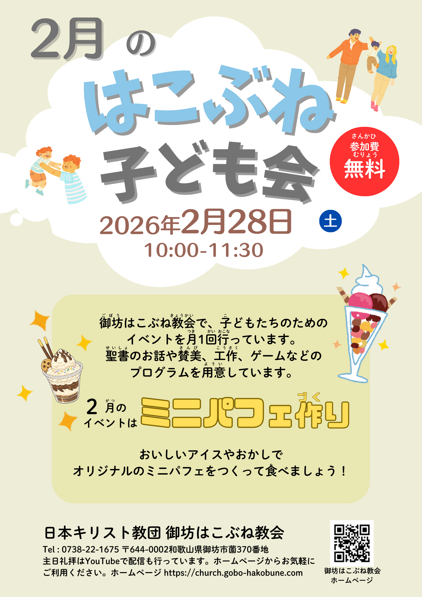 こんにちは。1月は何も断りなくお休みをしてしまって申し訳ありません。大変遅ればせながら、2026年もどうぞよろしくお願いします。 さて、あっという間に迎えた2月ですが、28日(土)10時00分より、「はこぶね子ども会」を予定しています!聖書のお話やさんびかを歌ったあとで、今月はミ […]