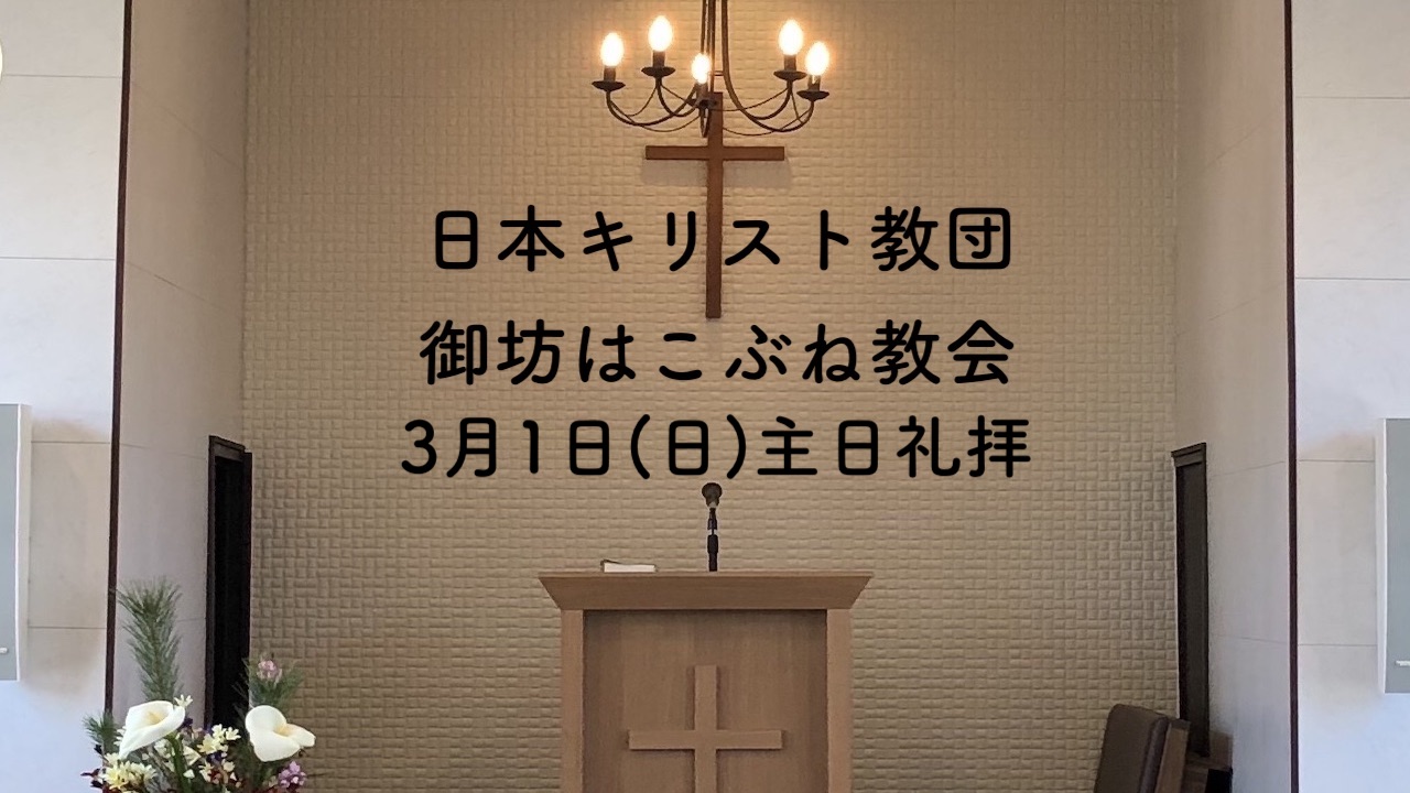 3月1日(日)10:30 聖餐礼拝(第一礼拝及び託児はお休み) 聖書:ルカによる福音書8章19-21節 説教:『キリストにおいて一つ』吉川良牧師 讃美歌:546、124、225、517、540 礼拝はYoutubeで配信も行っています。こちらからご覧ください。