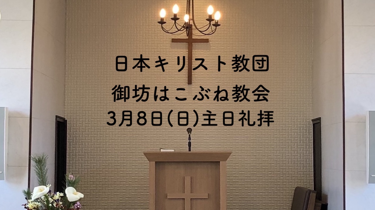 3月8日(日)第一礼拝9:00 第二礼拝10:30 聖書:ルカによる福音書8章22-25節 説教:『イエスさまを信じる』吉川良牧師 讃美歌:546、291、519、540 礼拝はYoutubeで配信も行っています。こちらからご覧ください。